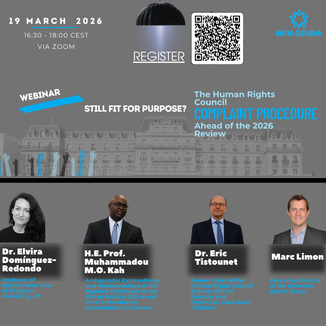 In light of this, and given the upcoming UN General Assembly review of the Human Rights Council in 2026, which may examine the continued relevance and effectiveness of the Complaint Procedure, the proposed webinar aims to explore these issues in depth from multiple perspectives, including academic analysis, practitioner experience, victims’ insights, insider understanding of the procedure, and the perspective of States. The objective is not only to enhance understanding, but more importantly to assess whether this mechanism, in its current form, can still achieve its objectives and keep its value, in particular, in the face of prevailing attacks on international legal order.