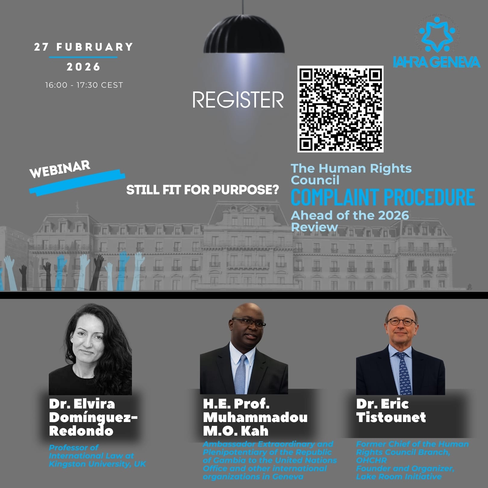 In light of this, and given the upcoming UN General Assembly review of the Human Rights Council in 2026, which may examine the continued relevance and effectiveness of the Complaint Procedure, the proposed webinar aims to explore these issues in depth from multiple perspectives, including academic analysis, practitioner experience, victims’ insights, insider understanding of the procedure, and the perspective of States. The objective is not only to enhance understanding, but more importantly to assess whether this mechanism, in its current form, can still achieve its objectives and keep its value, in particular, in the face of prevailing attacks on international legal order.